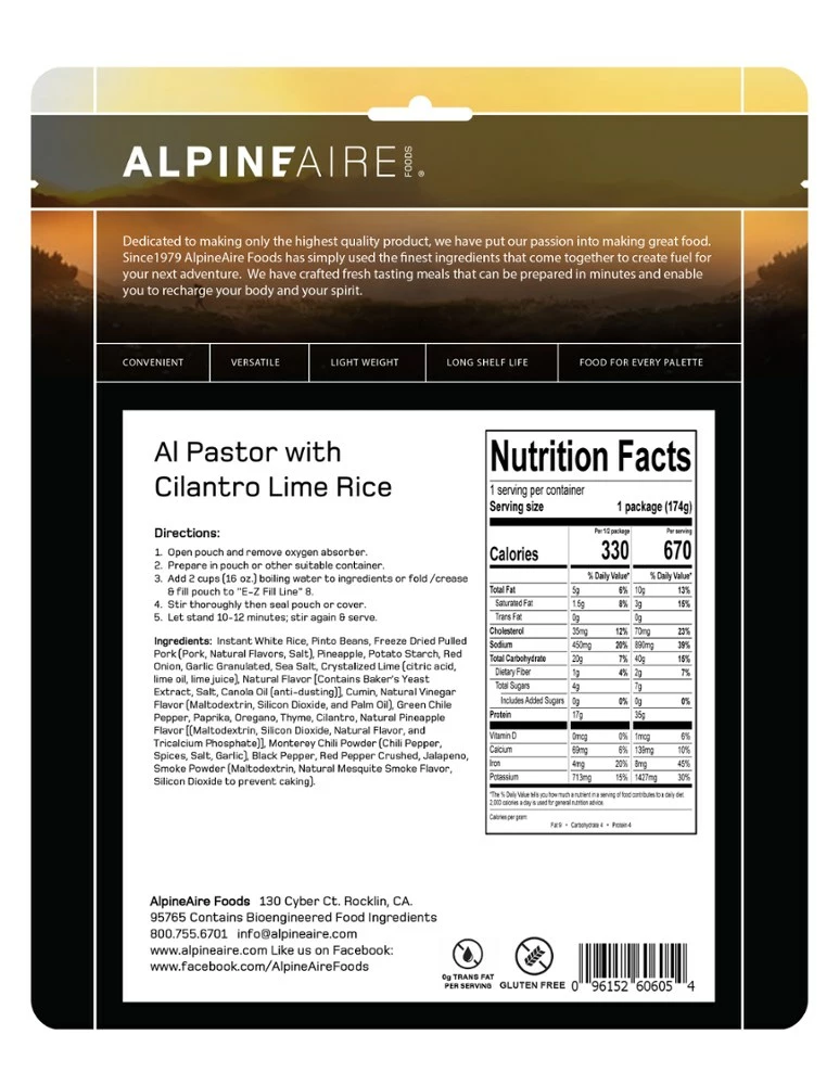 Bring the taste of street tacos to the backcountry with AlpineAire Foods Al Pastor with Cilantro Lime Rice, and enjoy tender, sweet and smoky pork over chiles, pineapple, pinto beans and rice.