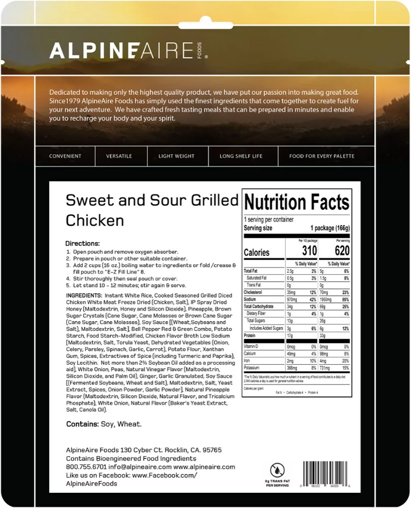 Combining chicken, bell peppers, pineapple and rice with a sweet and tangy sauce, AlpineAire Foods Sweet & Sour Grilled Chicken is a great-tasting and easy-to-prepare fuel for your adventure.