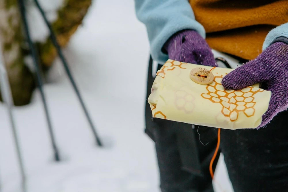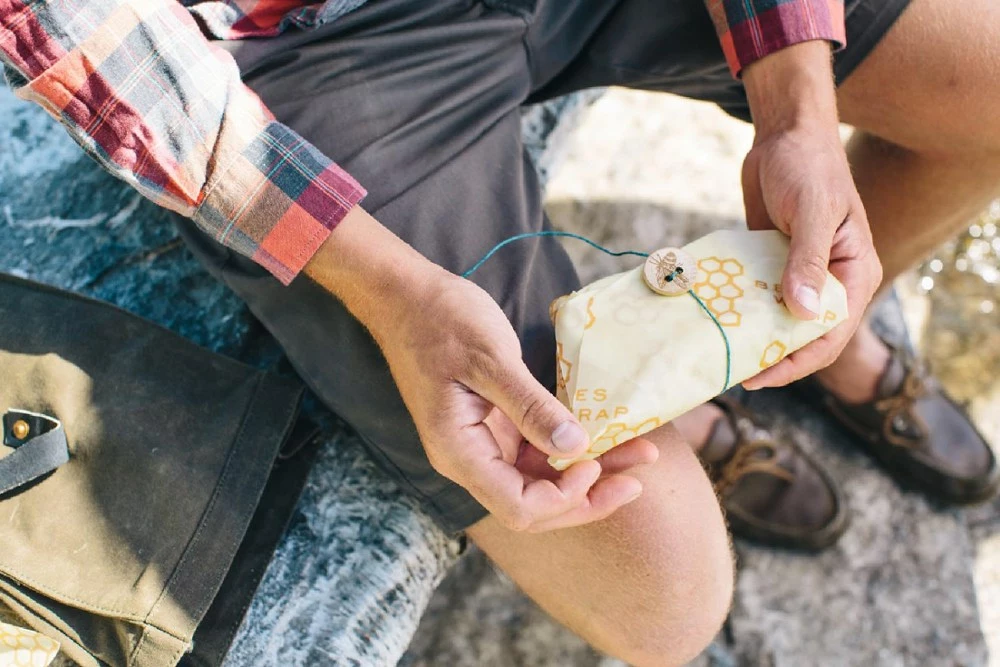 - Build your sandwich right on top of the sandwich wrap, fold in the corners, and wrap the string around the wooden bee button to seal; wrap doubles as a placemat at lunchtime