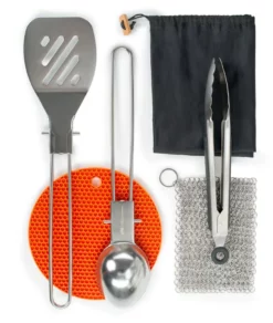 | Includes | Folding spatula, folding spoon, locking tongs, pot scrubber, pot gripper/trivet and storage sack |