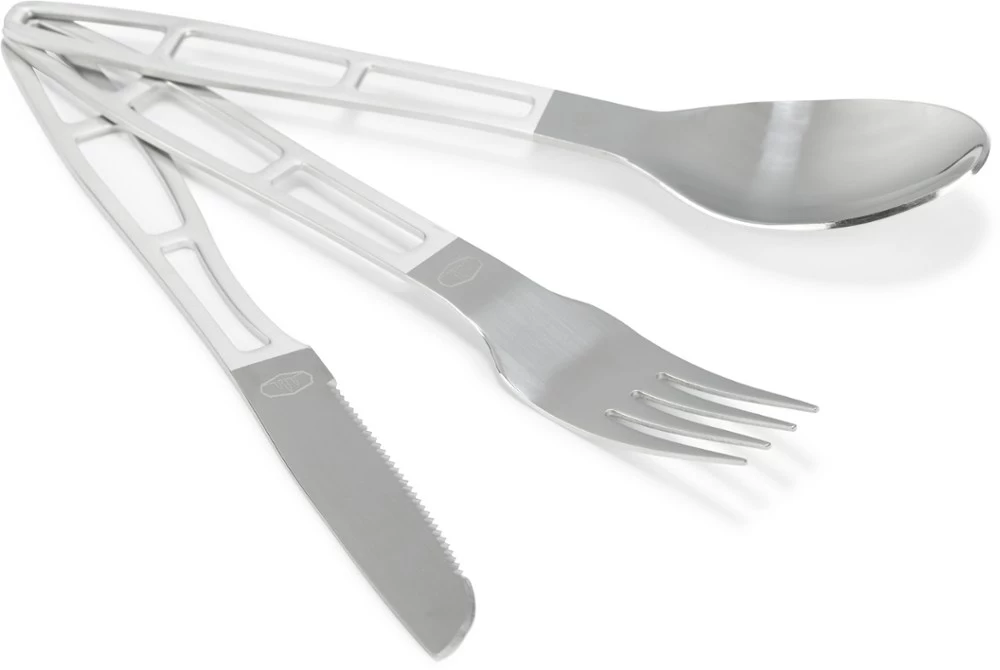 Stay civilized in the wilderness with the GSI Outdoors Glacier 3-piece stainless cutlery set. Stainless-steel fork, knife and spoon are light enough to pack, yet strong enough to face any adventure.