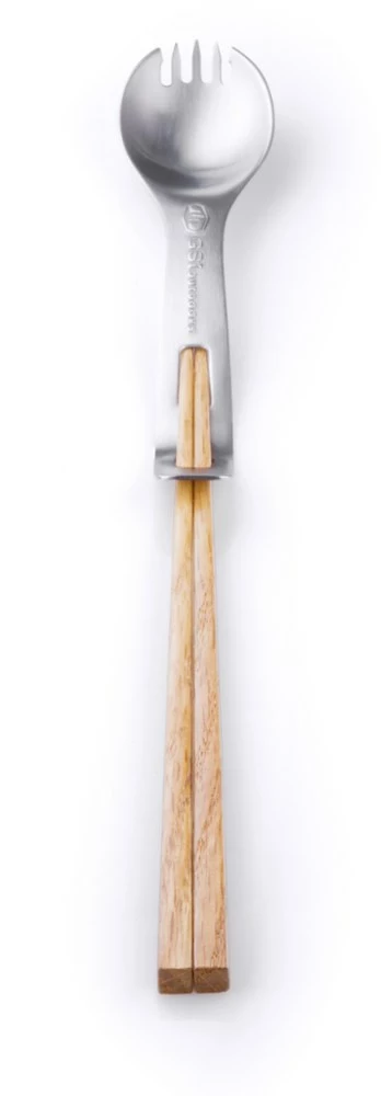 - Chopsticks slide into spork handle to create a long handled utensil that’s perfect for scooping, scraping or stirring rehydrated pouch meals or narrow pots
