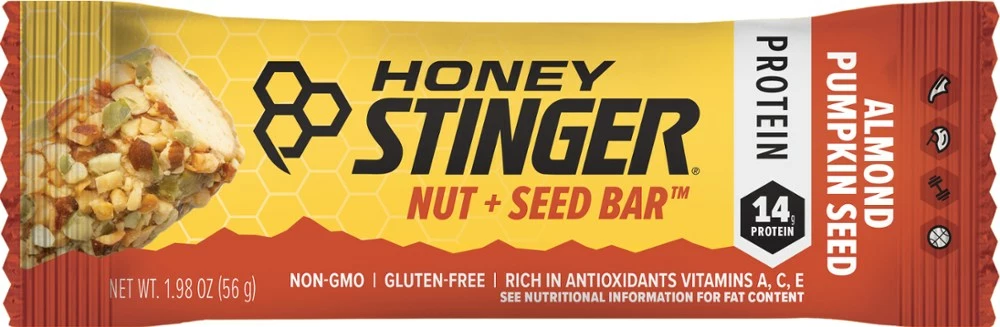 With a rich nut-butter core covered in caramel and rolled in crunchy nuts and seeds, the Honey Stinger Protein Nut + Seed bar is a delicious way to fuel your adventure.