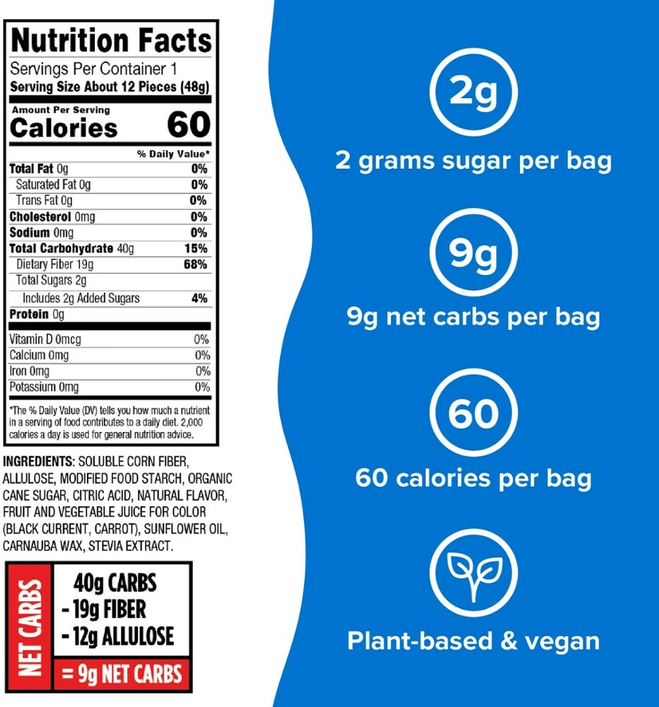 - Low-sugar and low-calorie candy—just 2 g of sugar, 9 g of net carbs and 60 calories per pack
