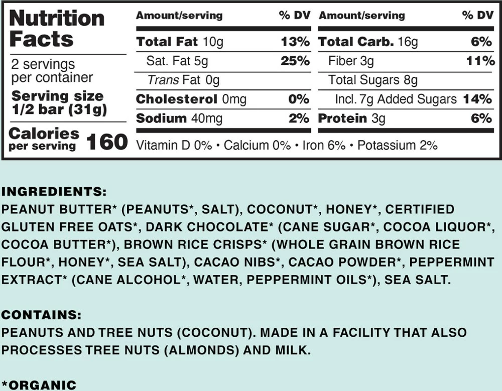 - USDA-certified organic ingredients include peanut butter, gluten-free oats, dark chocolate, peppermint extract and natural cacao powder