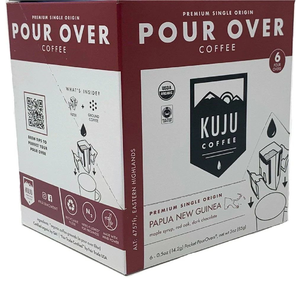 Make a perfect cup wherever you roam—no equipment required. Each Kuju Coffee Single Origin Single-Serve Pour Over coffee packet comes with a filter that anchors to your mug and brews in minutes.