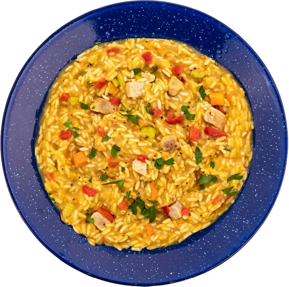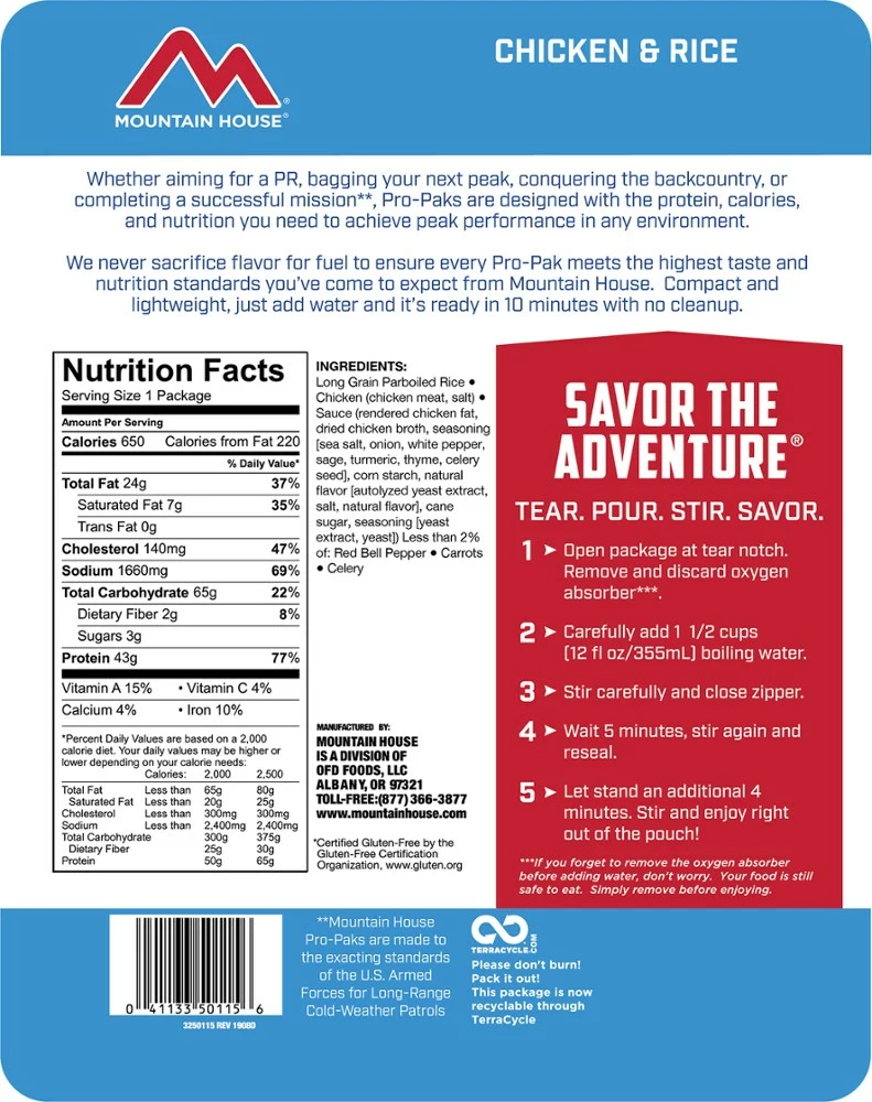 Enjoy a delicious, protein-packed meal of tender cooked chicken and hearty rice in the backcountry with the Mountain House Chicken & Rice Pro-Pak to get the fuel your body needs.
