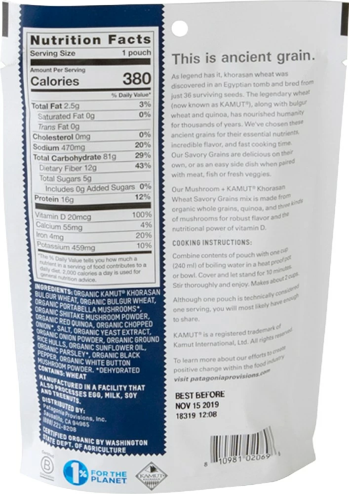 A blend of organic ancient grains, quinoa and portabella, shiitake and white button mushrooms, Patagonia Provisions Savory Grains Mushroom + Kamut Khorasan Wheat is ready in just 10 minutes.