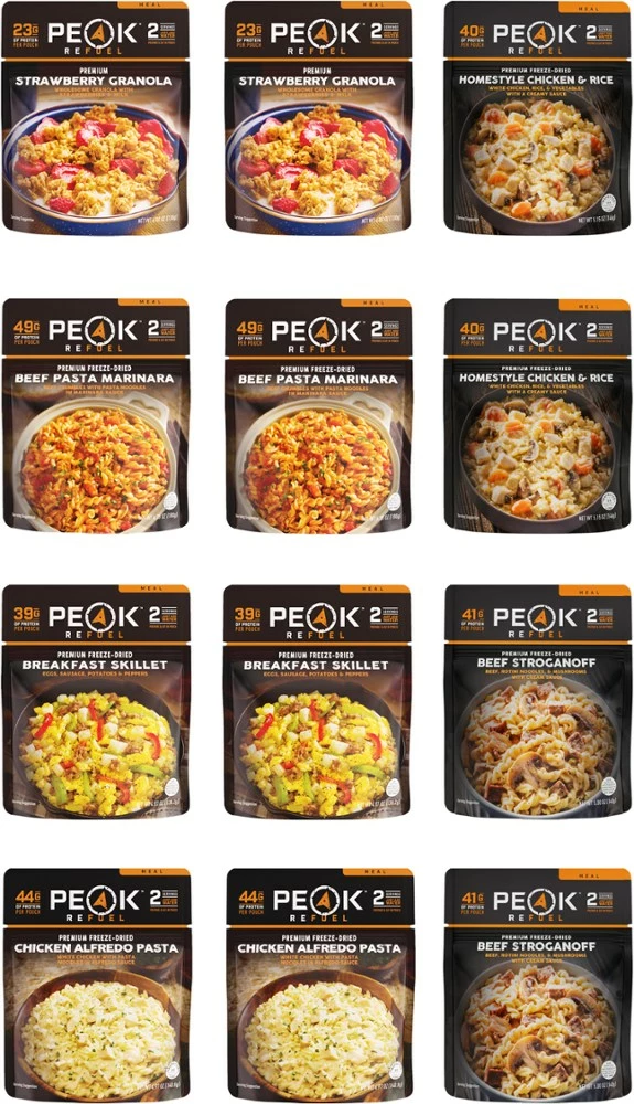 - Includes 12 pouches: 2 Breakfast Skillet, 2 Strawberry Granola, 2 Beef Pasta Marinara, 2 Chicken Alfredo Pasta, 2 Homestyle Chicken & Rice, and 2 Beef Stroganoff
