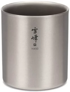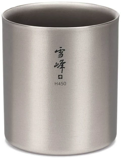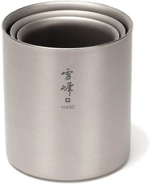 The Snow Peak titanium stacking double-wall insulated mugs come in a variety of sizes and nest together to take up minimal space. This one holds just about a pint.