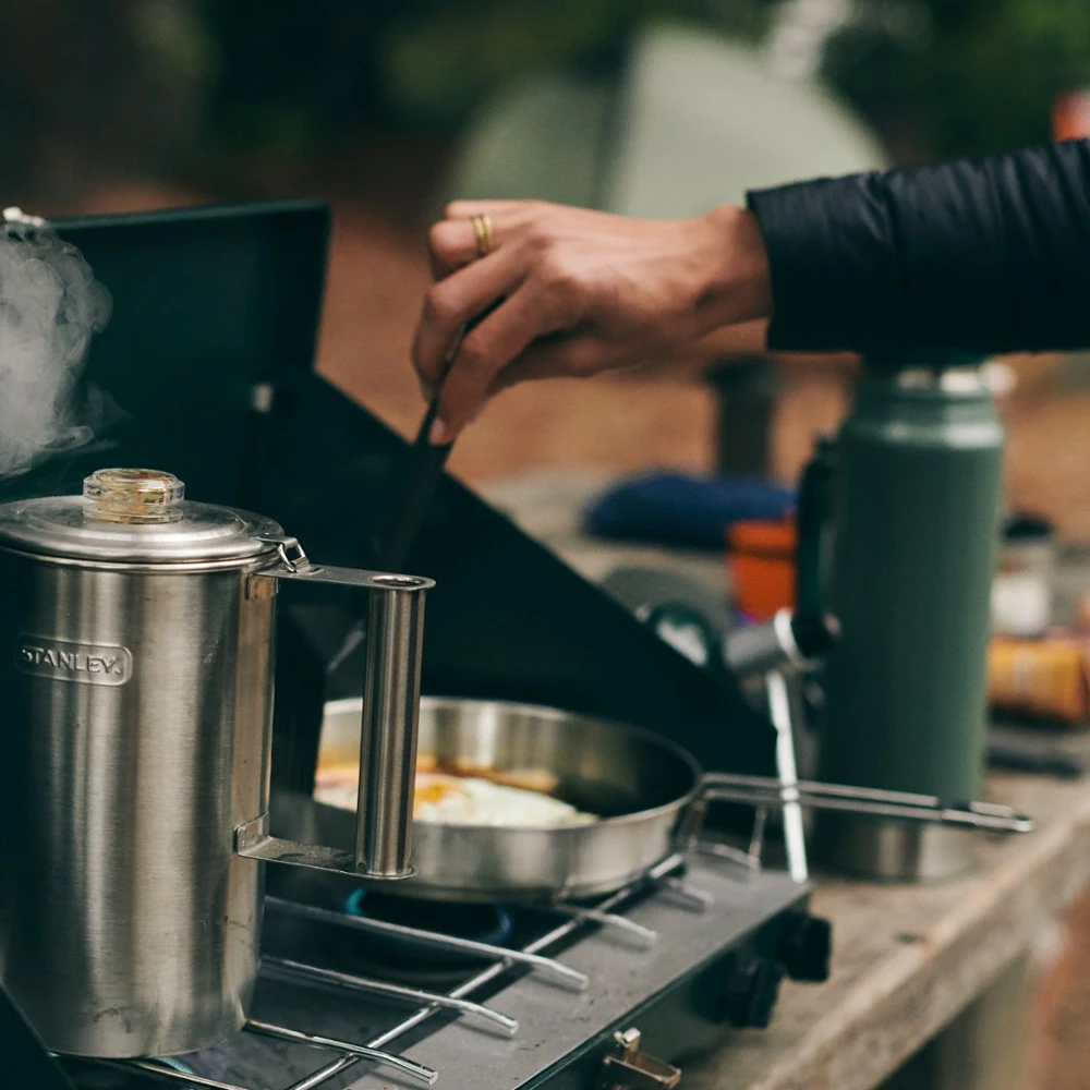 All you need is a stove, a knife and the Stanley Adventure Series Prep+Eat 9-Piece frying pan set. It has everything else you need to prep a meal and then eat it while camping.
