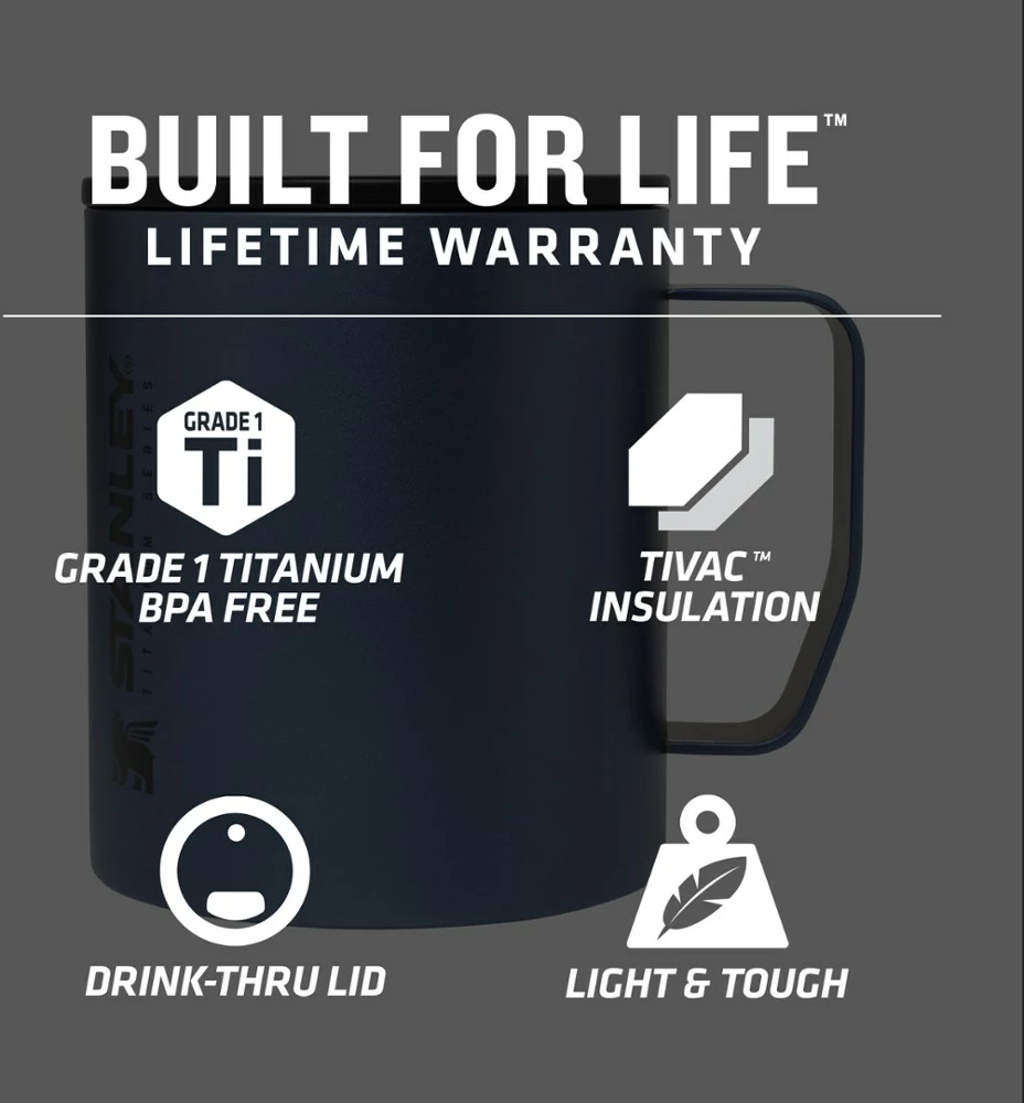Featuring TiVacâ„¢ double-wall insulation to keeps drinks hot or cold for hours, the 12 fl. oz. Stanley Stay-Hot Titanium camp mug is perfect for sipping your favorite beverage by the fire or on the go.
